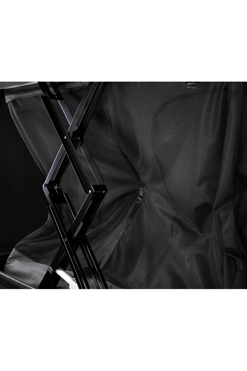 Ein Kreuzgelenkmechanismus aus Stahl ermöglicht das Anheben und Absenken des Zeltes.