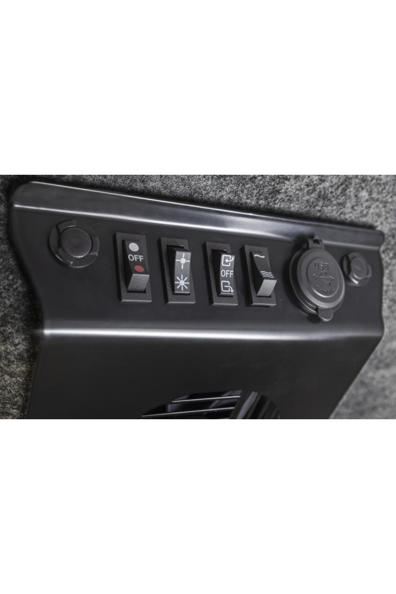 Das Altitude-Zelt wird über die Fahrzeugbatterie mit Strom versorgt, entweder über eine Kabelverbindung oder über eine Anderson 12-V-Steckdose. Die intelligent konzipierte elektrische Isolierung verhindert, dass die Batterie entladen wird, wenn das Zelt geschlossen ist, indem alle Lichter und elektrischen Geräte ausgeschaltet werden. Das Klimatisierungssystem besteht aus einem in die Decke integrierten Ventilator mit einstellbarer Geschwindigkeit, der die Luft sowohl ein- als auch ausströmen lassen kann.