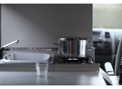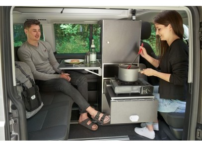 Module cuisine amovible se plaçant derrière le siége conducteur. Spécifique pour VW T5/T6 (tous types, Multivan et Beach) . Cet aménagement permet de garder un grand volume de chargement arrière ainsi qu'un couchage de 180/190cm. Permet de transformer en quelques minutes votre VW T5/T6 Multivan ou California beach en Camper.