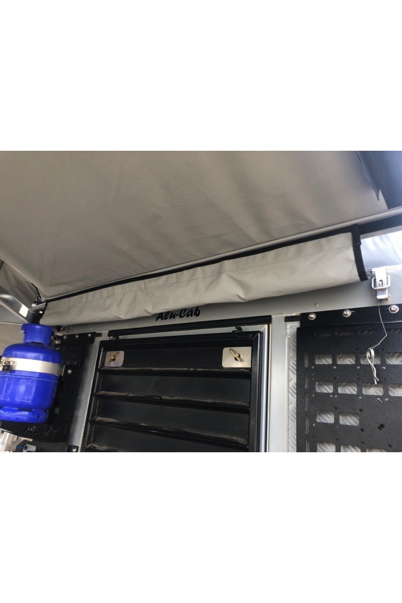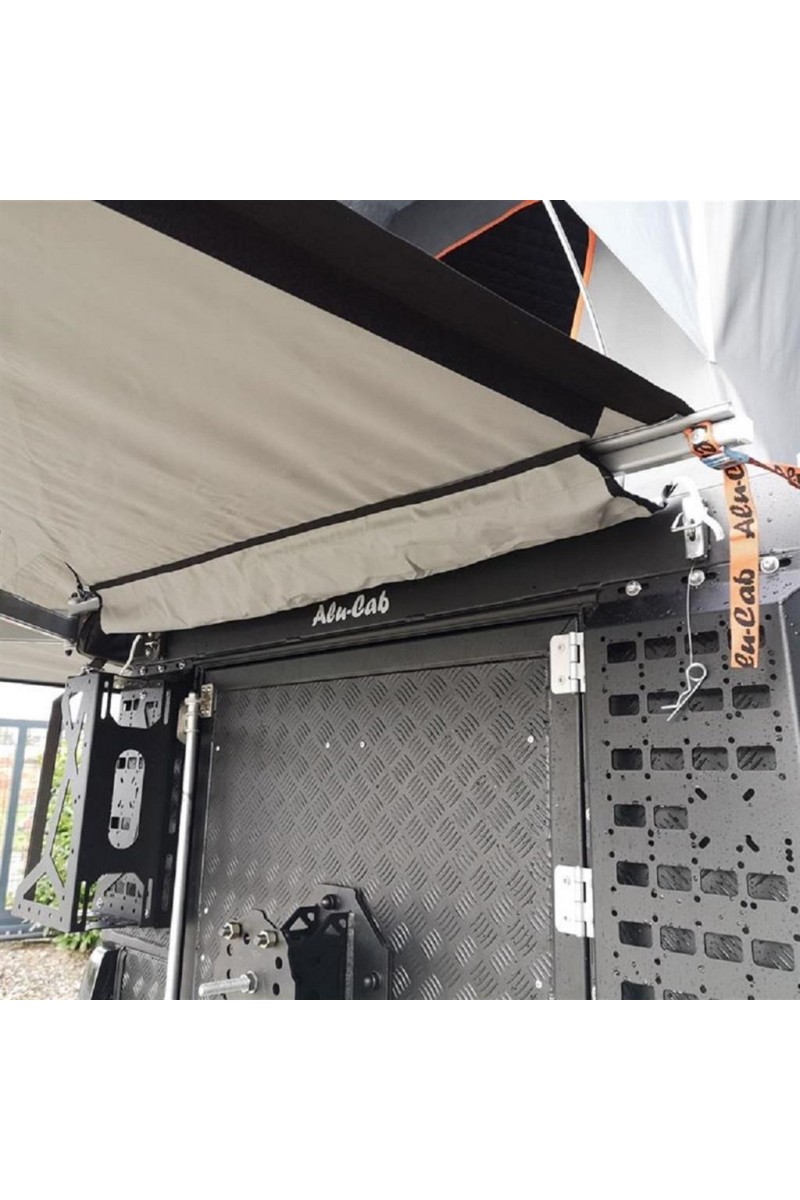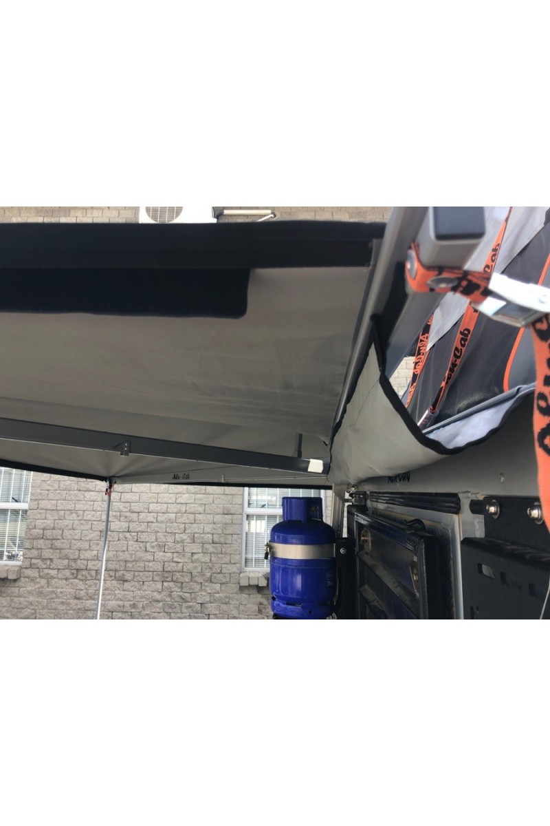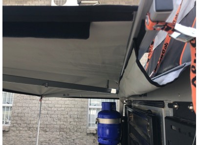 Le kit gouttière permet de rendre étanche la zone située entre l'arrière du véhicule et l'auvent. Ceci est particulièrement recommandé pour les véhicules dont la porte arrière s'ouvre latéralement. Pour l'installation, un rail alu doit être fixé au véhicule. La gouttière est ensuite glissée dans le rail de l'auvent et du véhicule et permet ainsi d'accéder au véhicule à l'abri de la pluie.