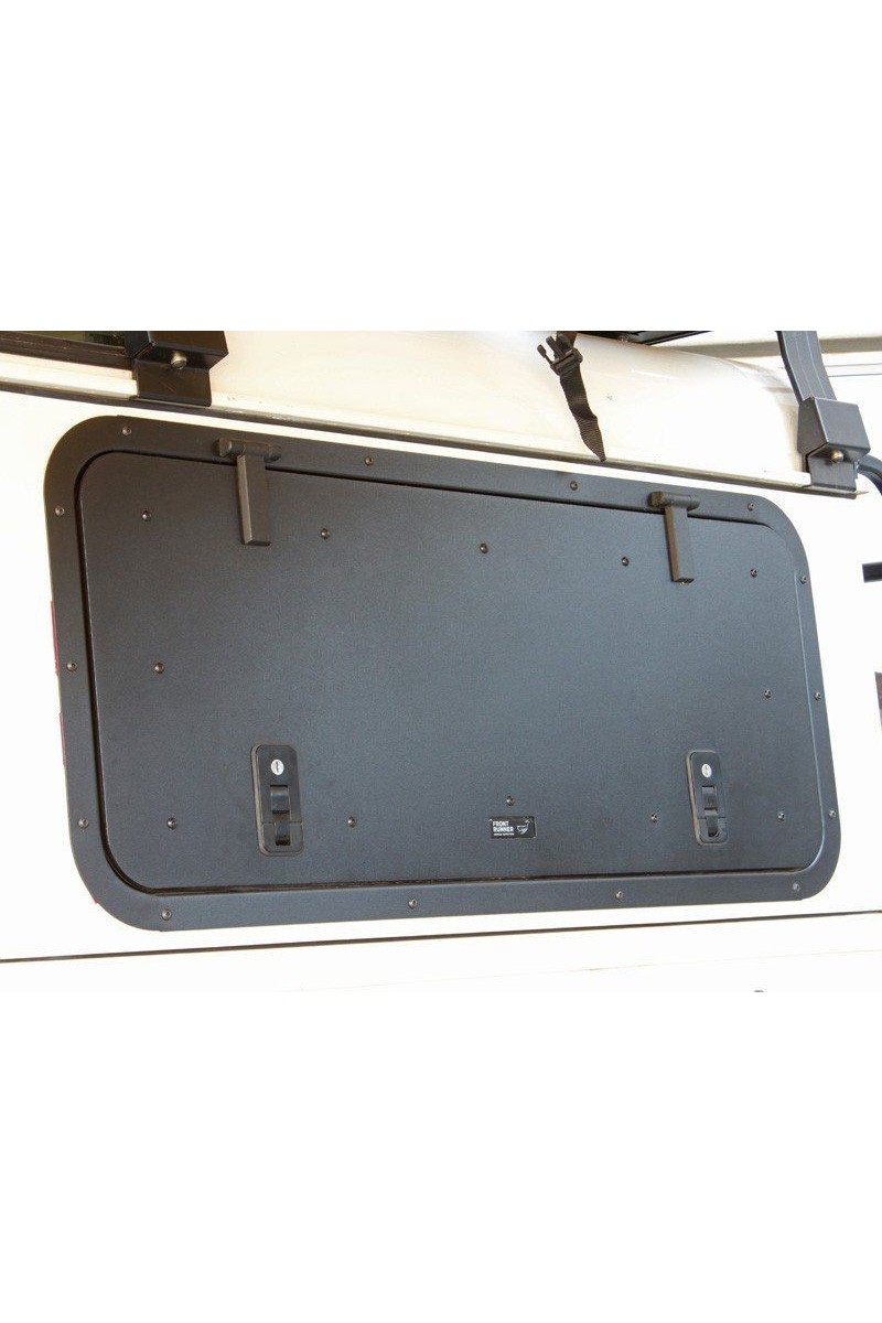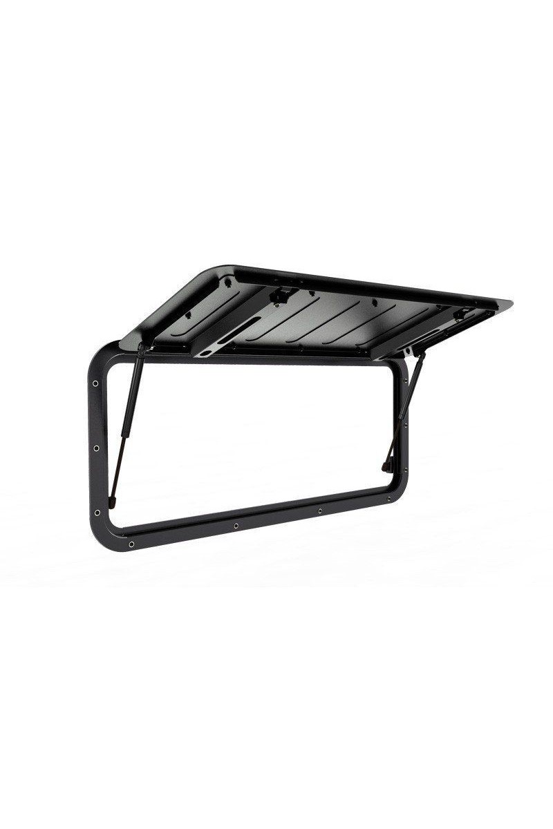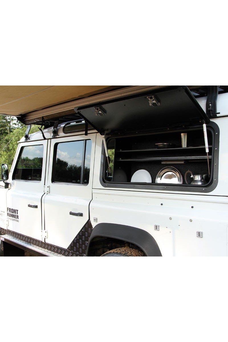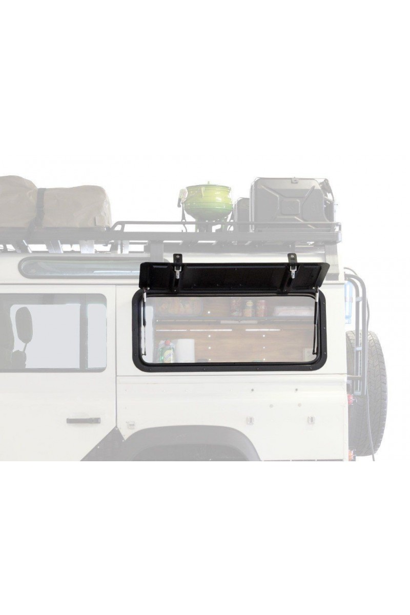 Le hayon latéral en verre de Front Runner remplace la fenêtre latérale d’un Defender et vous permet de basculer la fenêtre, ce qui crée un accès à 100% au contenu de votre espace de chargement.