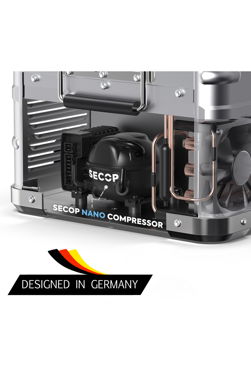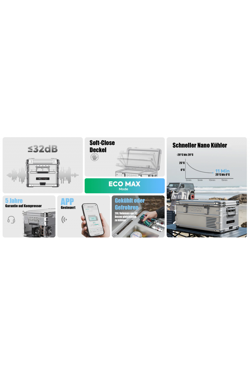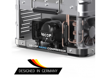 Avec ses dimensions compactes de 63,5 × 38 × 30 cm, elle trouve sa place presque partout tout en offrant une capacité de 20 litres. Grâce au compresseur SECOP Nano, elle atteint des températures de –20 °C à +20 °C en un temps record – seulement 11 minutes pour passer de 25 °C à 0 °C – tout en restant économe en énergie grâce aux modes Eco ou Max. Des LED lumineuses s’allument automatiquement à l’ouverture du couvercle – idéal pour un usage nocturne.