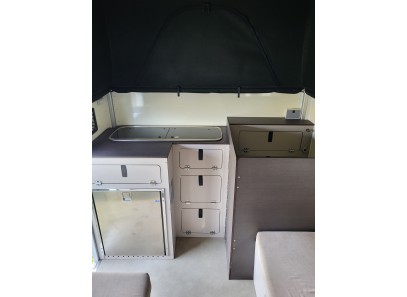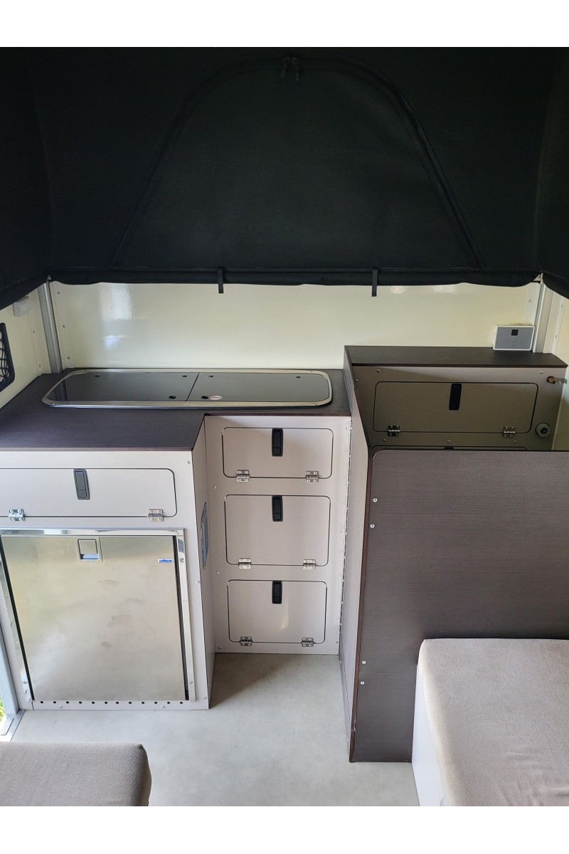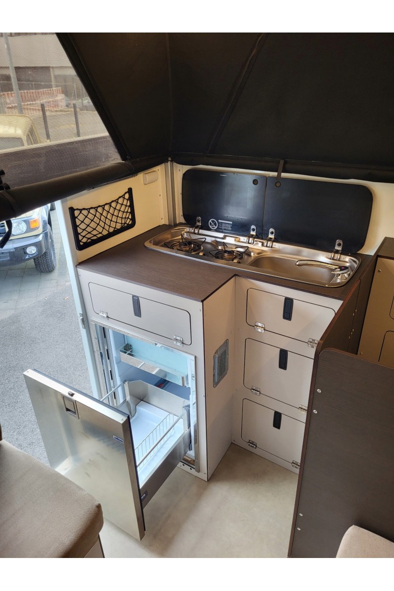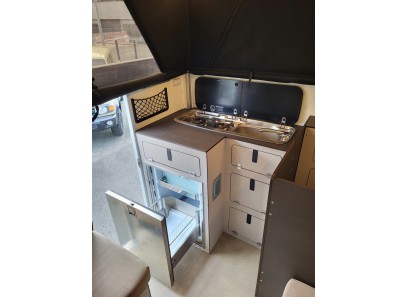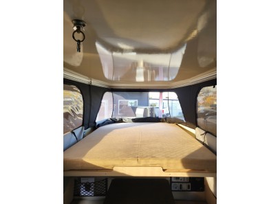 A l’intérieur, en équipement de base figure: cabine de douche, lit permanent sur vérins, frigo à compresseur de 85l, cuisson gaz, évier, réservoir d’eau de 78l, batterie auxiliaire, éclairage LED, etc.