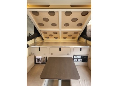 Il dispose donc d’un grand et très spacieux couchage en capucine avec lit permanent sur vérins de 140x195cm, d’une cabine de douche intérieure, d’un grand coin dinette pouvant être utilisé même quand le lit est fait et de nombreux rangements.