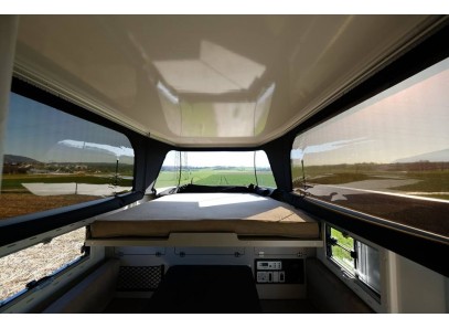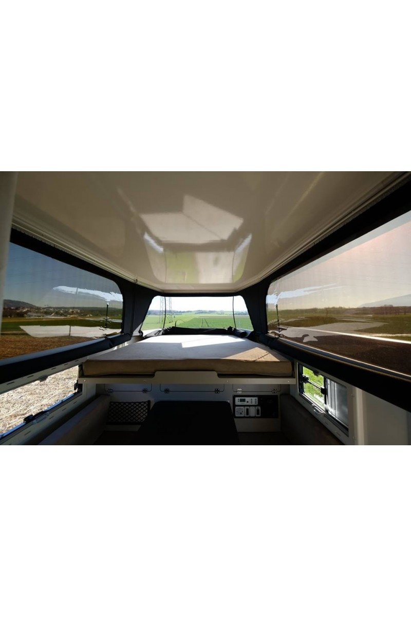 La cellule réalisée par Globe Camper est dotée de 4 vérins mécatroniques surdimensionnés assurant le relevage du toit horizontalement par un simple interrupteur. Ce système est extrêmement fiable et largement éprouvé. De plus la capucine biseautée améliore l’aérodynamisme tout en donnant un design plus affiné et moderne.