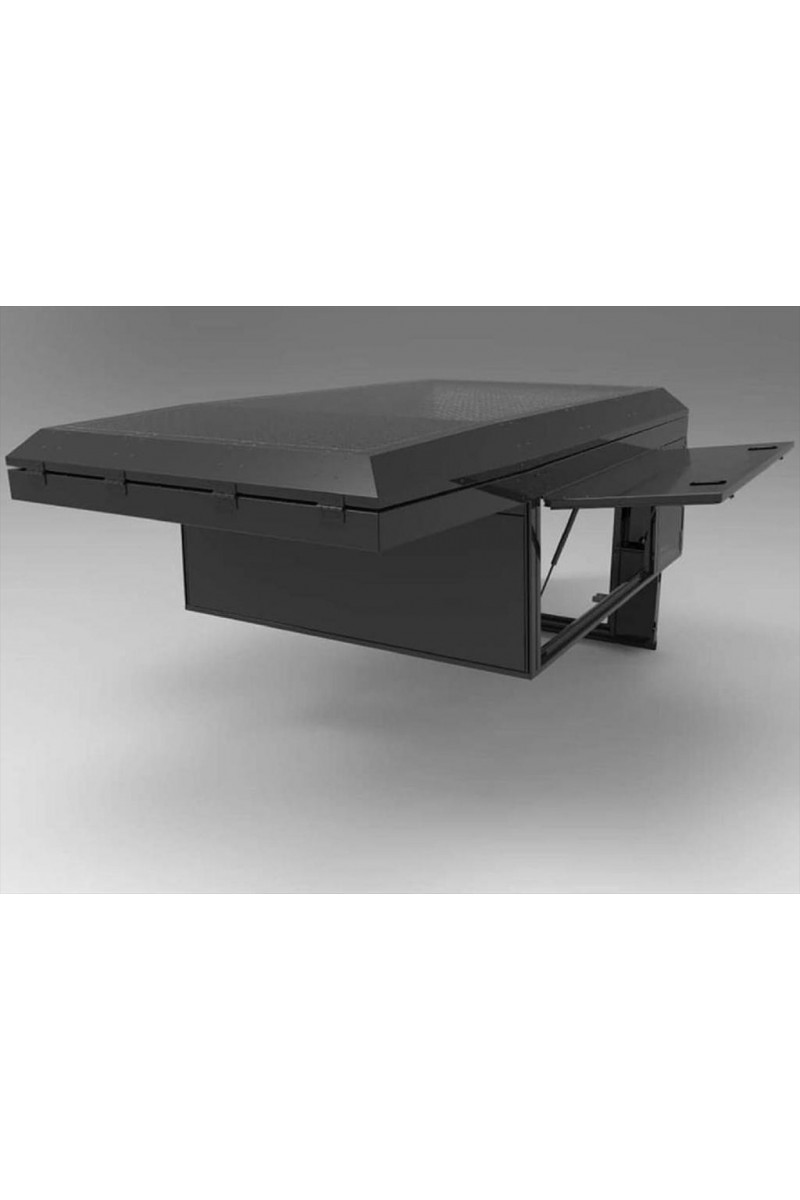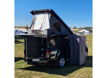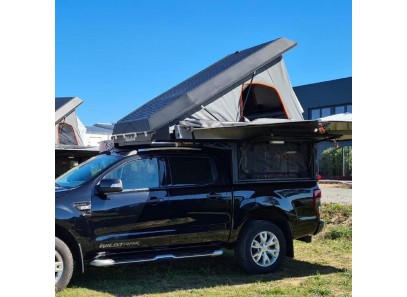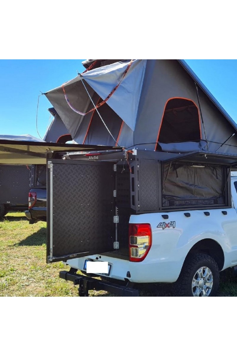 Le nouveau Kit Canopy Camper est l’équipement idéal les baroudeurs. C’est la combinaison idéale entre un hard top et une cellule. En effet, il s’agit d’un hard-top avec une tente de toit intégrée permettant un accès direct au couchage par le hard-top. L’accès se fait par la porte arrière (qui fait toute la hauteur, du plancher de la benne jusqu’en haut du hard-top). Comme tous les hard-top Alu Cab, ce Canopy Camper est fabriqué en aluminium et est équipé de portes latérales type « papillon ». Le kit Canopy camper est disponible en couleur noir et gris.
