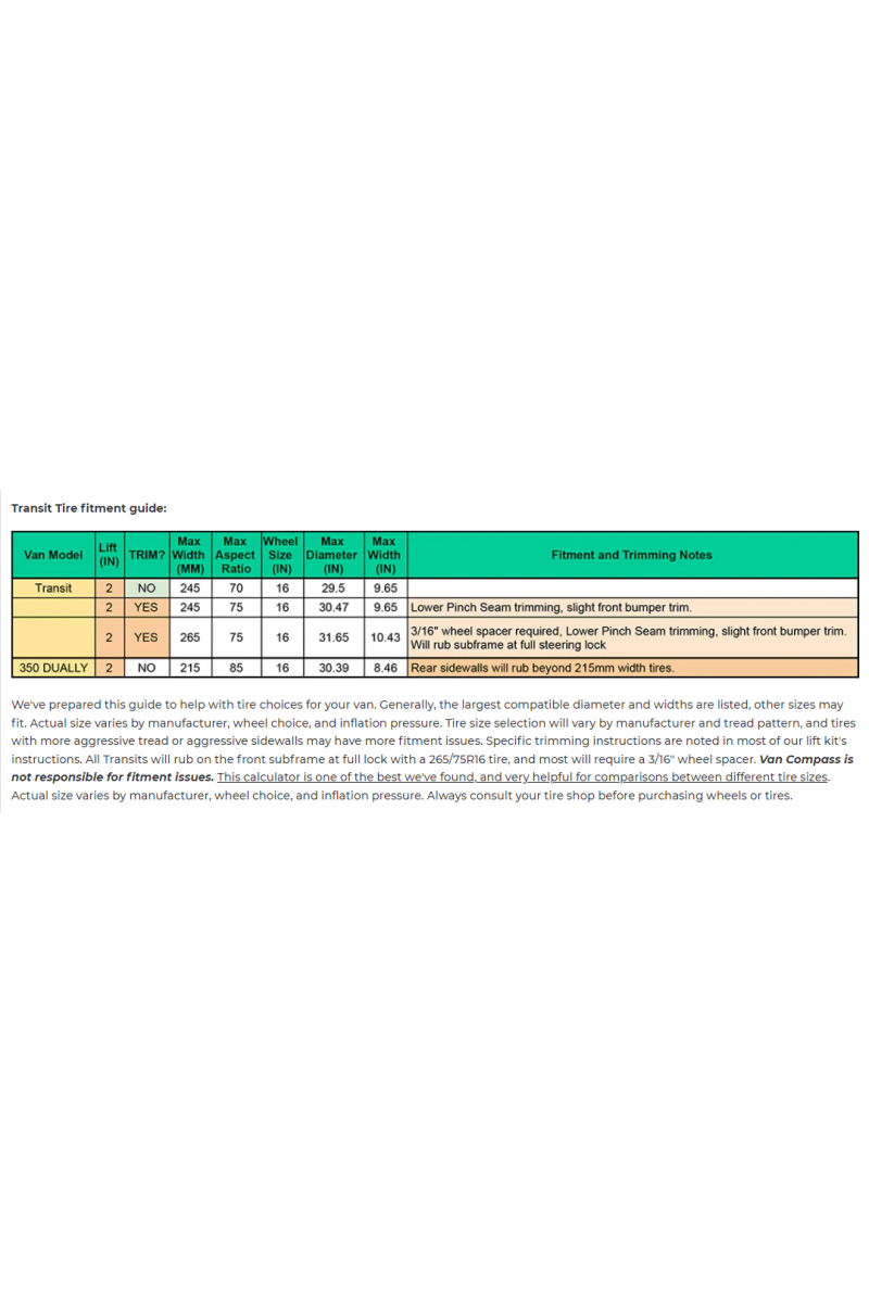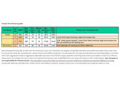 **NOTE** Les tailles de pneus varient considérablement d'un fabricant à l'autre. L'ajustement de la carrosserie variera pour cette raison et un certain contact avec le sous-châssis de la suspension est possible à plein braquage avec des pneus 265/75R16.¬† De plus, certains pneus 265/75R16 nécessiteront l'utilisation d'une entretoise de roue de 3/16 po d'épaisseur pour dégager le corps de la jambe de force.¬† Si nécessaire, nous offrons une entretoise spécifique à l'AWD pour ce scénario, disponible à l'achat ici :¬†