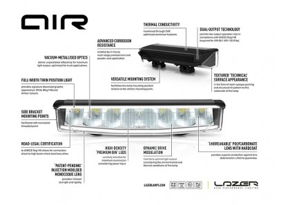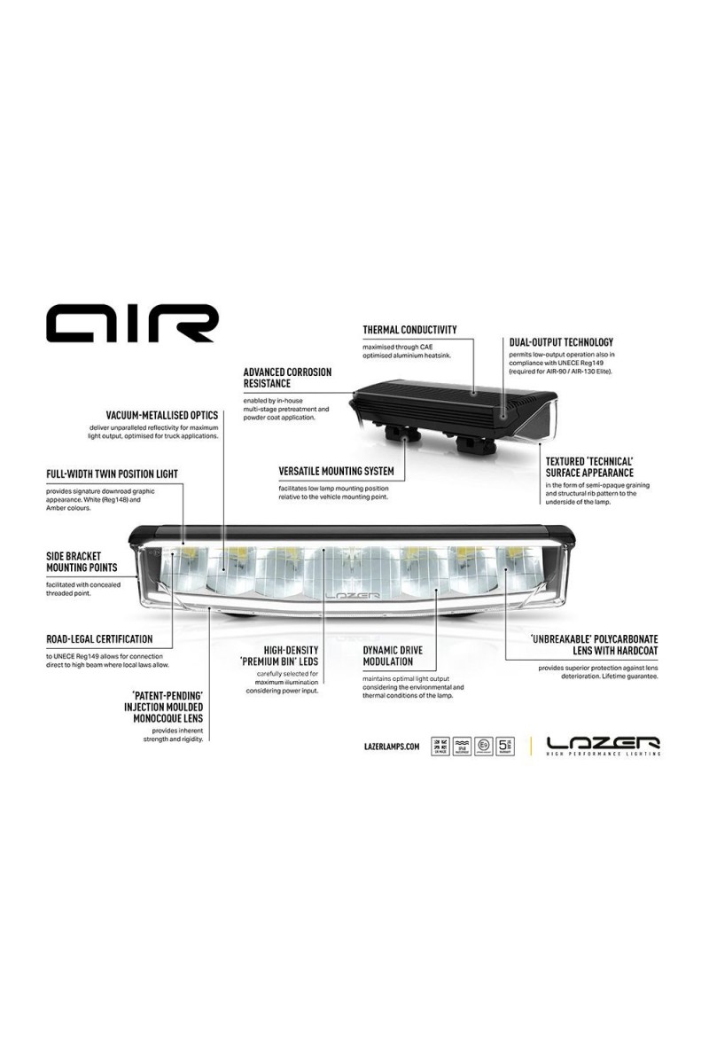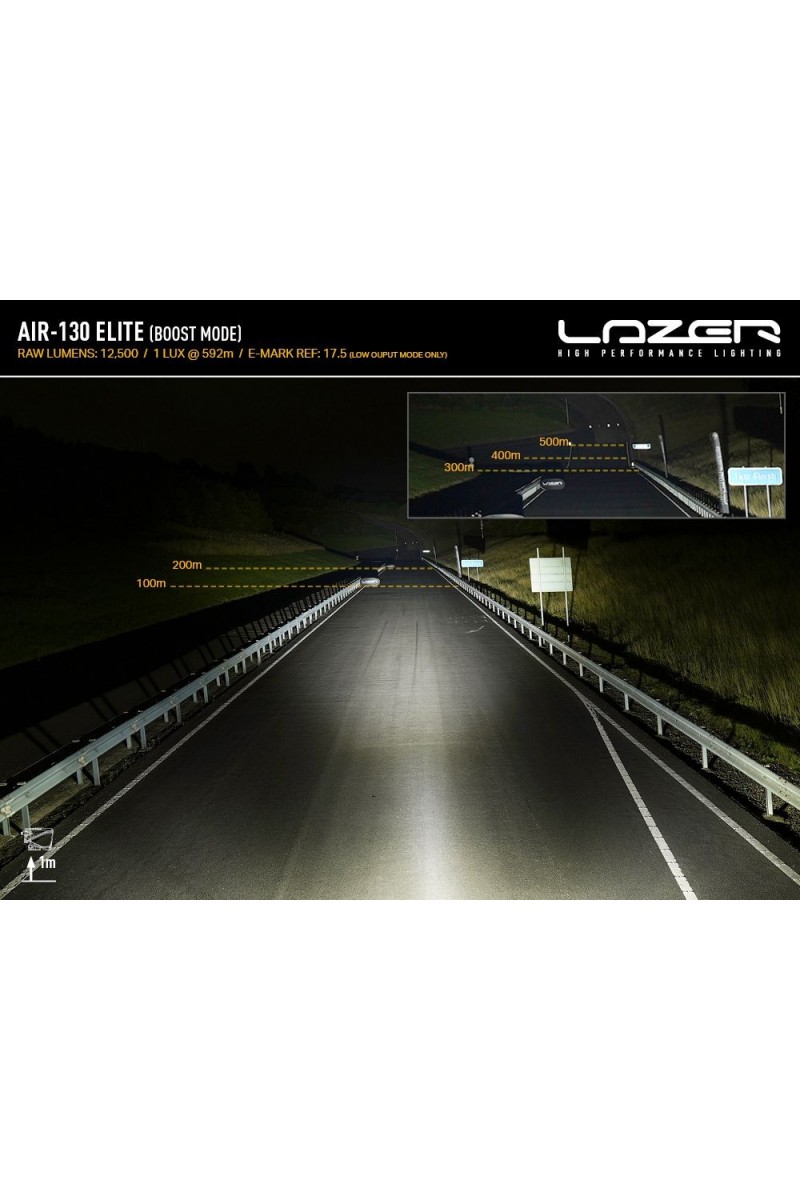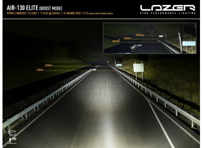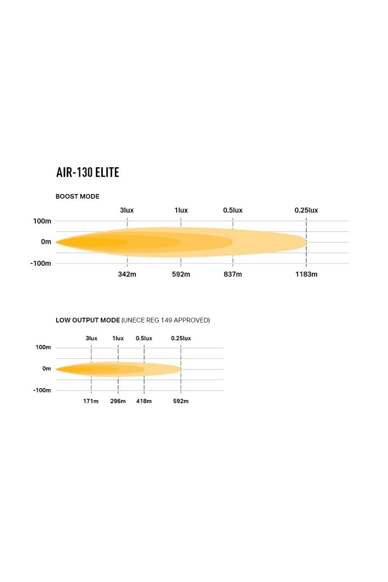 L'AIR-130 Elite, globalement équivalente en termes de distribution de lumière à la Triple-R 1000 Elite, représente le summum de la performance d'éclairage compte tenu de la taille et de la puissance de la lampe, tout en ayant la robustesse et la fiabilité assurées, soutenues par notre garantie complète de 5 ans. Émettant 12 500 lumens bruts et avec 1 lux livré à 592 m, l'AIR-130 Elite inclut des PCB noirs pour donner à la lampe une apparence furtive en contraste avec les autres produits de la gamme AIR. La distribution de la lumière a été soigneusement conçue avec une répartition verticale et horizontale optimisée pour une utilisation routière, y compris à partir de positions de montage plus élevées sur le véhicule. Les performances du faisceau de route de la lampe, fonctionnant à 100 %, sont supérieures aux paramètres admissibles de la réglementation UNECE Reg 149 pour un feu de conduite légal sur route, donc la fonctionnalité à double sortie permet une réduction de la puissance pour se conformer aux limites de la réglementation.