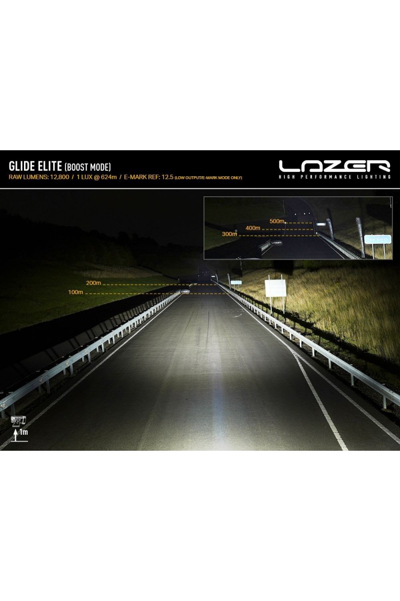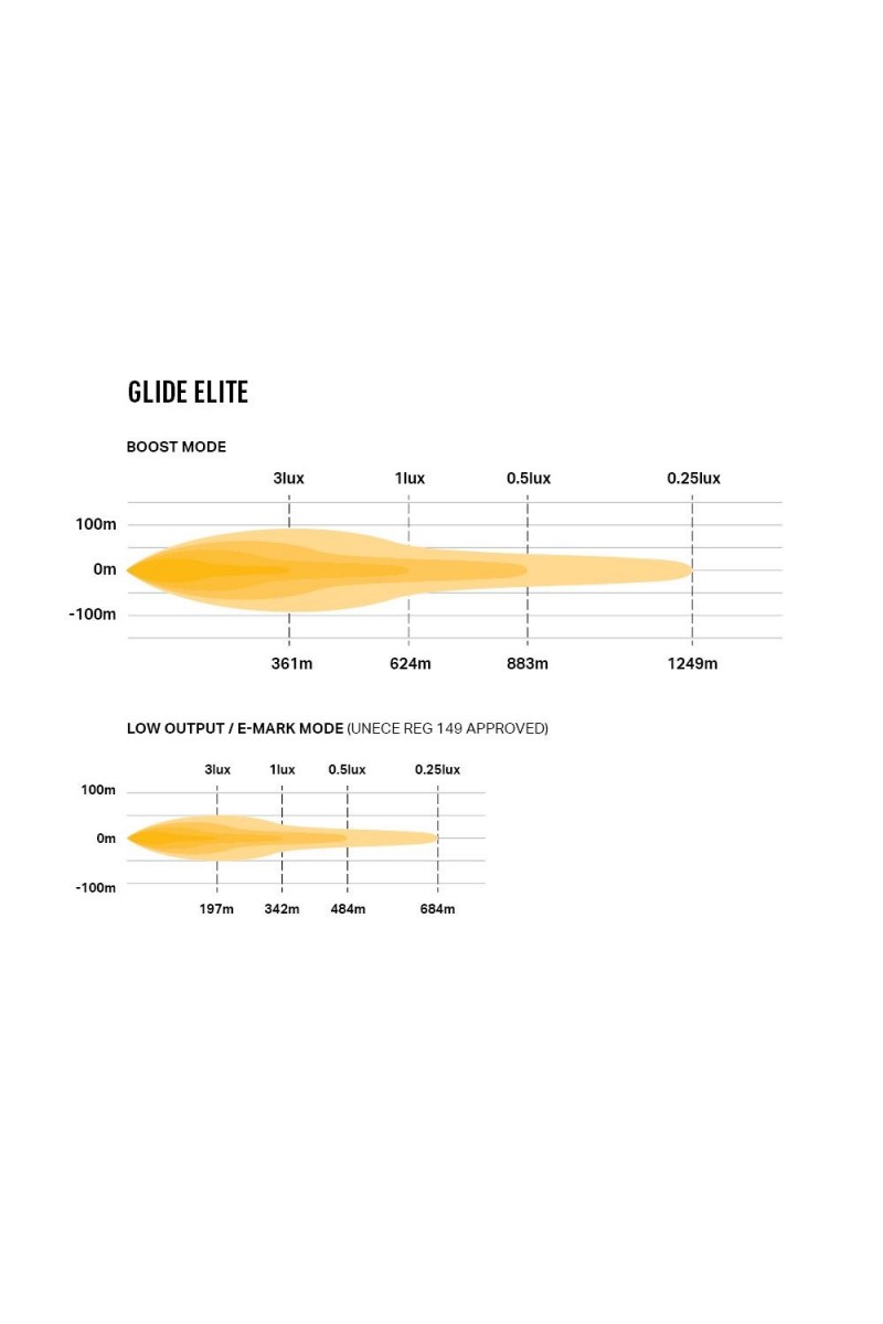 À l'instar de tout produit Lazer portant l'étiquette « Elite », la Glide Elite, compte tenu de la taille de la lampe, offre les niveaux les plus élevés de sortie lumineuse cohérente dans une distribution de faisceau soigneusement conçue dérivée d'une combinaison d'optiques Spot et Wide et de l'arrangement des LED. Ces optiques, métallisées sous vide en interne par Lazer pour maximiser la réflectivité, exploitent les 12 900 lumens bruts pour délivrer 1 lux à 624m tout en maintenant une répartition horizontale de la lumière de 66 degrés. Les LED de qualité supérieure utilisées dans les lampes Glide Elite sont soigneusement sélectionnées pour leur CRI de 80, cet indice de rendu des couleurs élevé offrant une meilleure définition des couleurs et des formes pour une expérience de conduite nocturne plus claire et plus sûre.