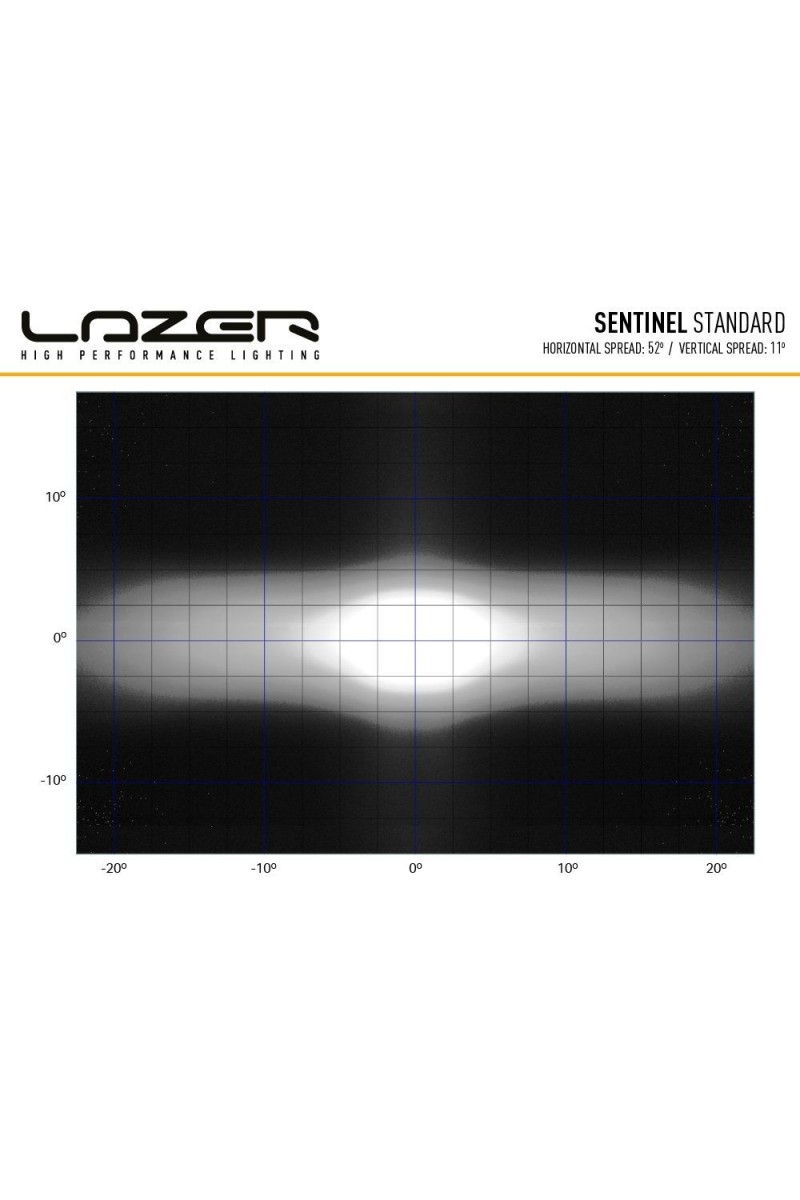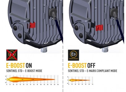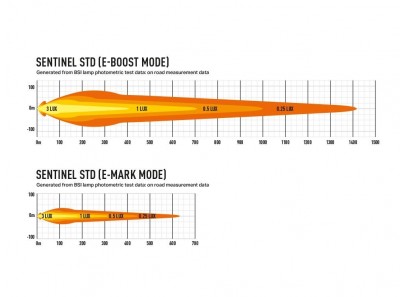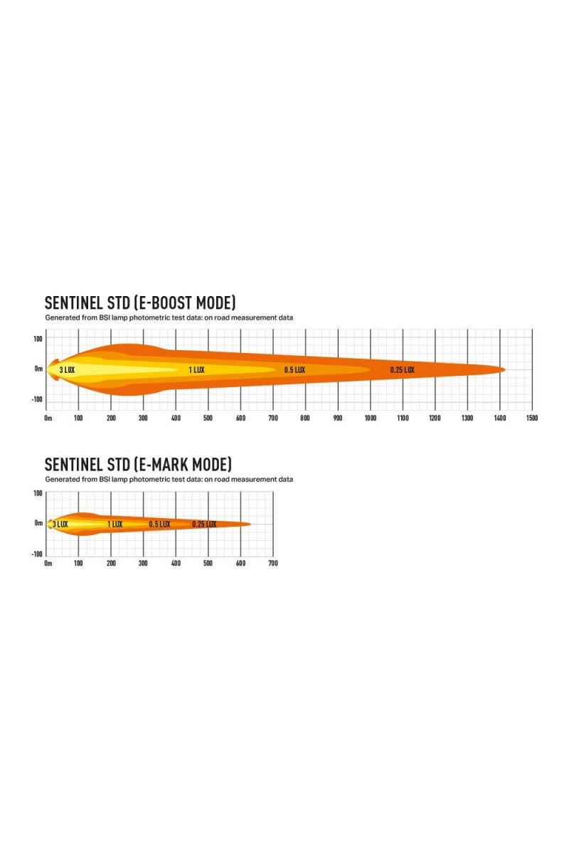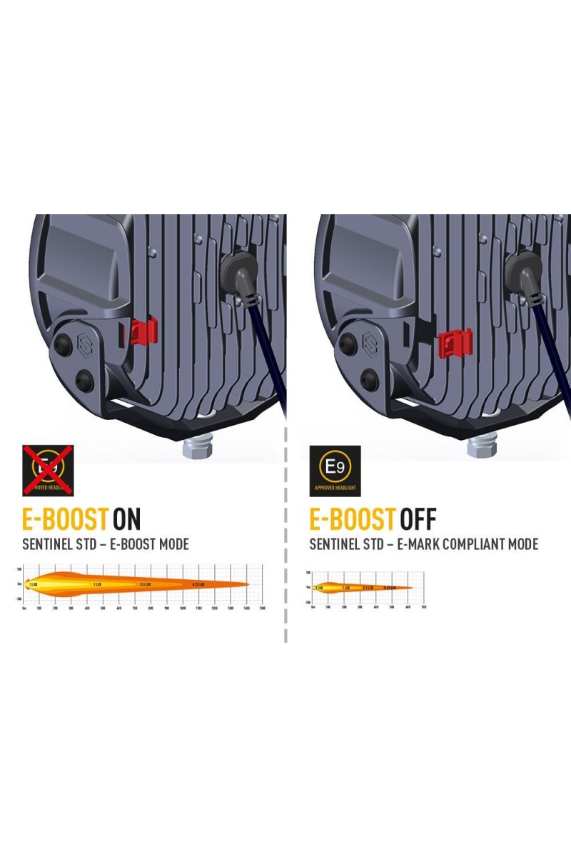 Les lampes Sentinel Black et Chrome, dans la gamme "Standard", offrent les mêmes performances d'éclairage. Emettant 9 529 lumens bruts, les lampes fournissent 1 lux à plus de 700 m ; impressionnant en soi, mais compte tenu de l'angle de faisceau horizontal de 52 degrés, c'est un produit qui a été conçu pour fournir une visibilité maximale pour toutes sortes d'utilisations sur route et hors route. Comme tous les produits Lazer, la température de couleur agréable de 5000K est agréable à l'œil, tout en maximisant la netteté et la définition des objets devant soi. La lampe est homologuée par la CEE-ONU conformément à la réglementation 112 en tant que feu de route, grâce à l'adoption de la technologie E-Boost à double sortie de Lazer ; en fonctionnant à 100 %, la sortie de lumière est au-delà de la limite autorisée par la réglementation de la CEE-ONU, de sorte que le retrait du capuchon Boost fourni à l'arrière de la lampe réduit la sortie de lumière pour la ramener dans la limite autorisée.