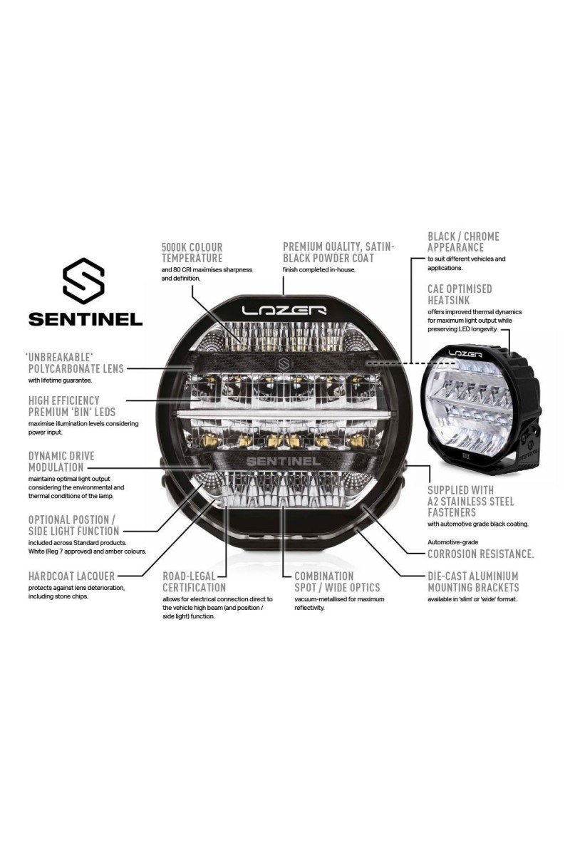 Nouveauté pour 2021, la gamme Sentinel est composée de lampes rondes de 228mm qui combinent un design haut de gamme distinctive, des performances d'éclairage supérieures et une qualité de fabrication symbolique du nom de Lazer Lamps. Disponibles en version Standard ou Elite, les premières intègrent 20 LED de haute puissance et sont disponibles avec une finition noire ou chromée à l'intérieur de la lampe. Le produit Elite, en comparaison, n'est disponible qu'avec l'aspect interne noir, mais avec une combinaison de 32 LED haute puissance, il représente la meilleure performance d'éclairage que l'on peut attendre d'un produit portant l'étiquette "Elite".