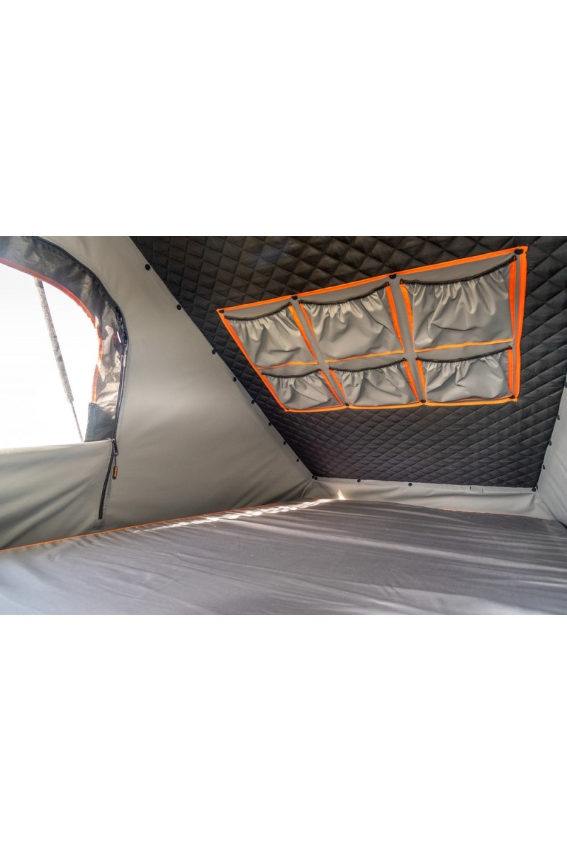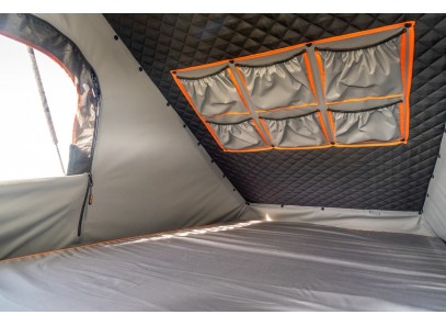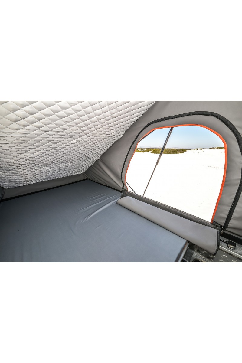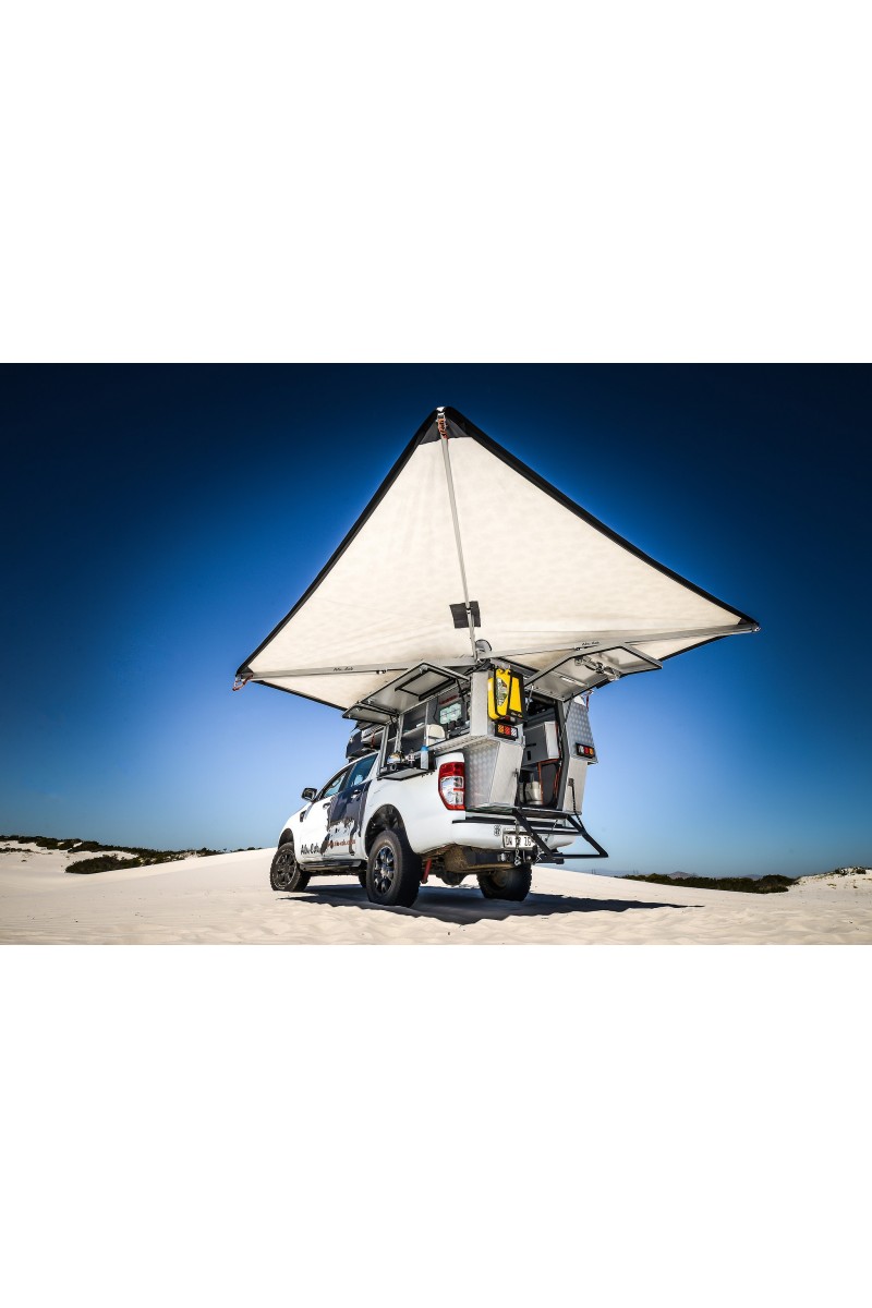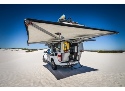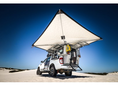 Un store autoporteur à 270°, rapide à monter, est installé sur le côté gauche. Il couvre à la fois le côté et l'arrière de la cabine et peut être transformé en un auvent d'environ 10m² à l'aide de parois latérales disponibles en option. Une gouttière est également disponible pour étanchéifier la zone entre l'arrière du véhicule et l'auvent.