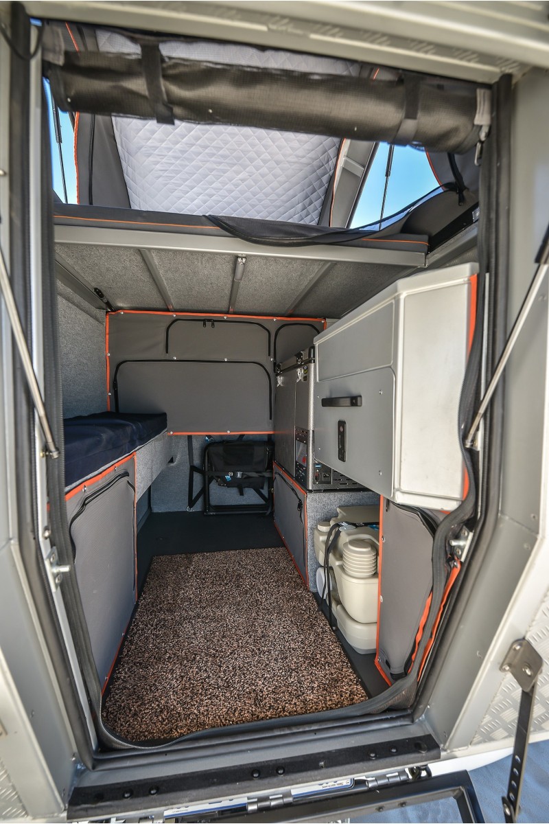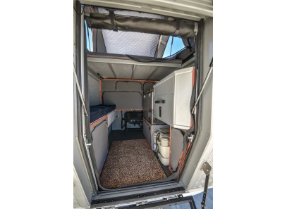 Dans la partie arrière droite de la cabine se trouve une plaque de cuisson Dometic Kombi avec évier en acier inoxydable de haute qualité. En combinaison avec la surface de couchage rabattable du toit relevable, plus rien n'empêche donc de cuisiner à l'intérieur par mauvais temps. Une glacière et un congélateur de Snomaster, disponibles en option, sont placés directement à côté de la table de cuisson. Un réservoir d'eau fraîche de 80 litres, situé au centre de gravité, permet de ne pas se retrouver rapidement à sec.