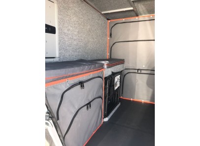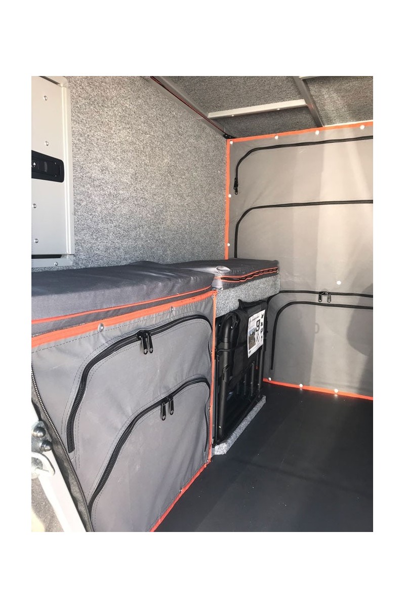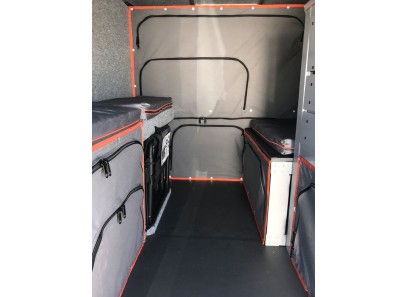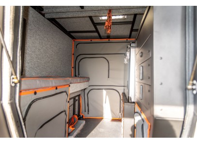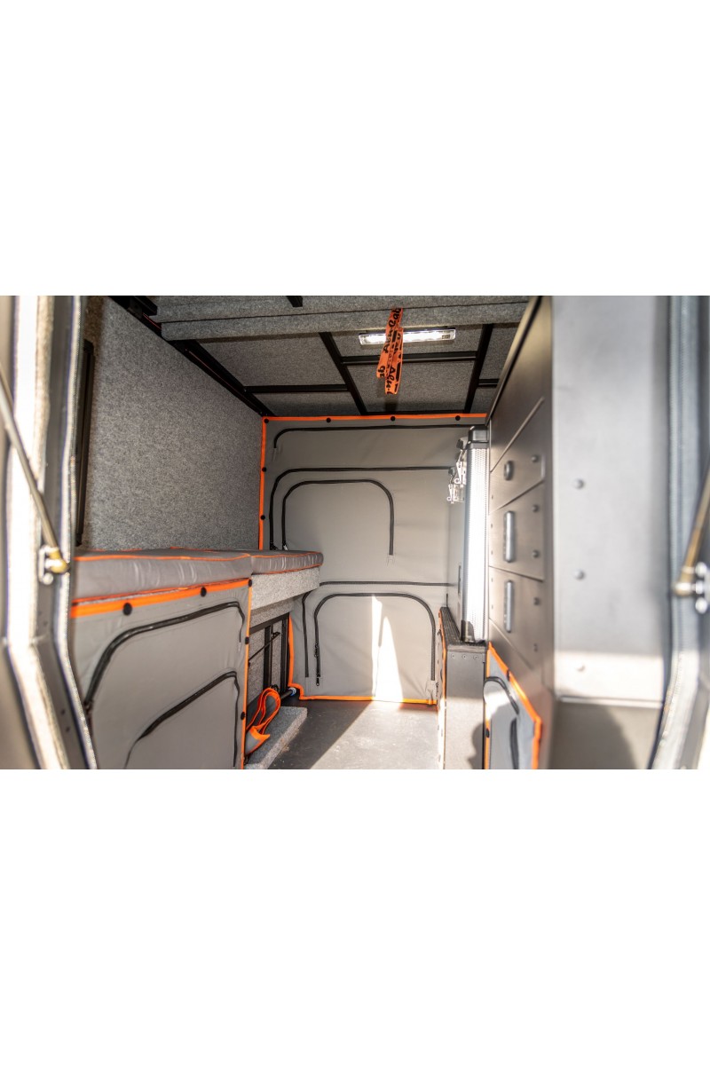 Sur le côté gauche, il y a un siège rembourré et d'autres compartiments de rangement avec des fermetures éclair. Les nombreuses lampes LED à lumière alternante rouge et blanche, intelligemment placées, constituent un atout supplémentaire. Elles assurent à tout moment et partout dans l'espace intérieur une bonne visibilité et la bonne ambiance.