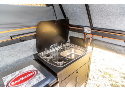 -Bloc cuisine avec réchaud à gaz 2 feux, évier, 2 tiroirs, 2 compartiments de rangement avec portes en tissu (version Comfort)