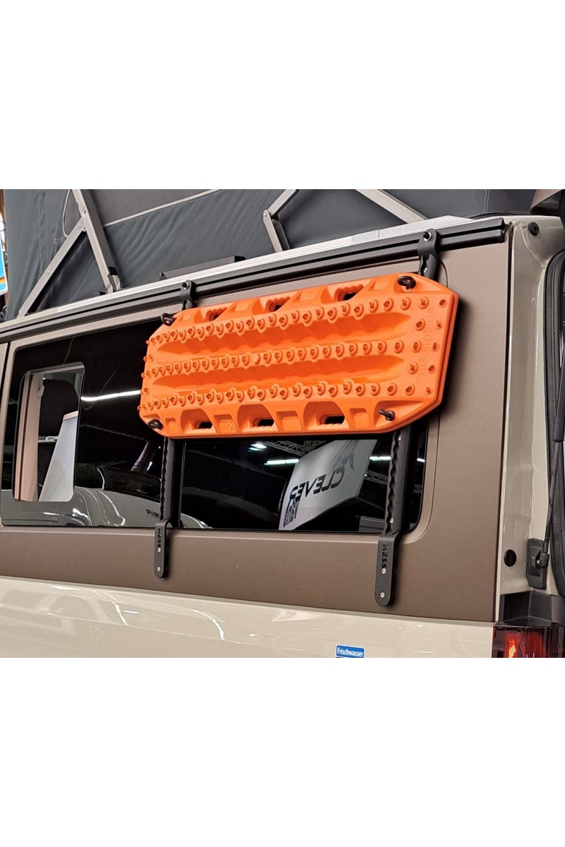 Support Airline en tôle d'aluminium peinte en noir mat. Convient pour accueillir divers accessoires tels que des plaques de désensablage Maxtrax. Force d'adhérence par aimant selon le fabricant : 31 kg.