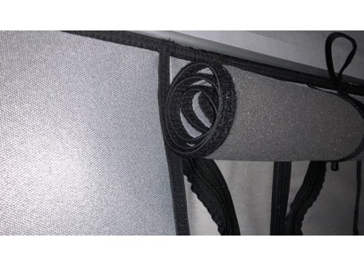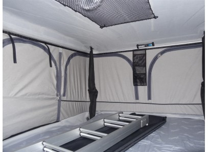 La coque du toit est revêtue d'un isolant textile pour l'isolation thermique et sonore et est munie d'un grand filet de rangement. Trois petites poches en filet peuvent être positionnées à volonté dans la tente à l'aide d'une fermeture velcro. Pratique pour le téléphone portable ou les lunettes.