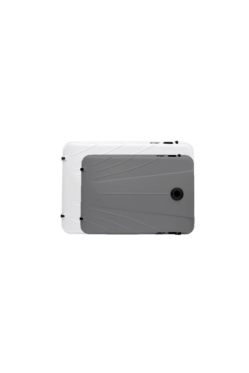 4 fermetures avec doubles sécurités. 2 aérations. 6 pattes de fixation, filetage 8 mm, écrous Nylstop. Points de fixation pour l’échelle, incorporés dans la coque. pour l’échelle, incorporés dans la coque.